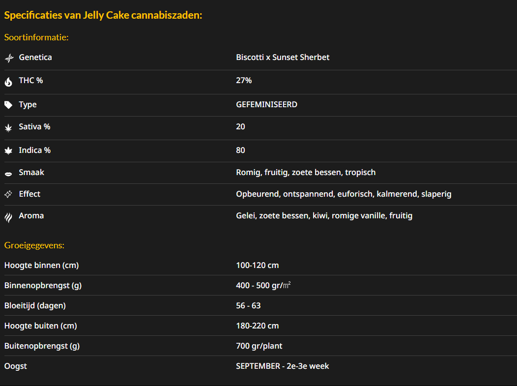 Met een indrukwekkend THC-gehalte tot wel 27% verleidt Jelly Cake de zintuigen met een luxueuze mix van kiwi- en watermeloensmaak, omhuld door een romige zachtheid die als fluweel op de tong blijft hangen. Krachtig, verrukkelijk en onweerstaanbaar verfijnd – deze soort geeft een nieuwe betekenis aan verfijning.