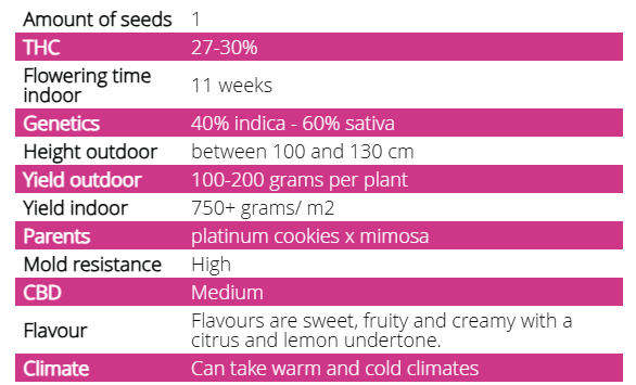Met trots introduceren we Platinum Mimosa Cookies in een uitzonderlijk beperkte oplage, een verleidelijke hybride geboren uit de fusie van Platinum Cookies en Mimosa.