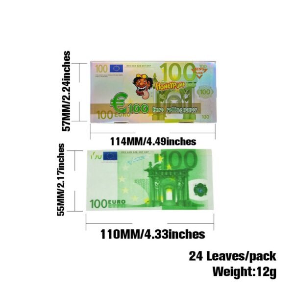 Honeypuff €100 King Size Vloeitjes (Doos van 12, 32 velletjes per doos) Voeg een vleugje luxe toe aan uw rookervaring met Honeypuff €100 King Size Vloeitjes. Deze vloeitjes, ontworpen om op een bankbiljet van €100 te lijken, bieden een originele en unieke uitstraling. Gemaakt van natuurlijke, ongebleekte vezels, zijn deze king-size vloeitjes (110 x 50 mm) voorzien van een natuurlijke plakstrip voor een gemakkelijke sluiting. Elk boekje bevat 32 langzaam brandende vloeitjes voor een gelijkmatige, schone verbranding met minimale as. Deze vloeitjes zijn vrij van chemische kleurstoffen en gebruiken niet-giftige, plantaardige kleurstoffen voor een veilig en milieuvriendelijk product.