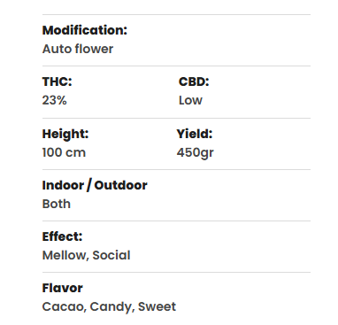 Het is een ideale plant voor kwekers op elk ervaringsniveau. Of je nu een beginnende kweker bent of een goeroe met groene vingers, deze indica auto zal je niet teleurstellen. Hij stelt nooit teleur.