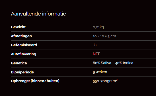Haar sativa invloeden zorgen ervoor dat ze uitgroeit tot een lange dame. Haar toppen zijn dicht en groot, bedekt met een royale hoeveelheid hars wat haar een heldere en glanzende look geeft.