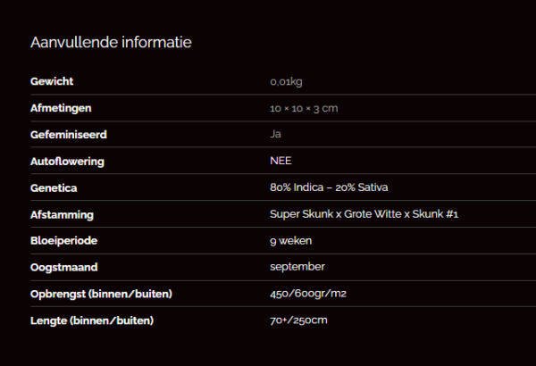 Onze kostbare “La Blanca Gold” is lang en vertakt, met zware, met kristallen bedekte toppen op elke tak, zeer geschikt voor buitenkweek, zelfs onder minder gunstige omstandigheden, vanwege haar verbazingwekkende schimmelbestendigheid. Buiten kan ze wel 2,5 tot 3 meter hoog worden. Binnen voelt ze zich ook helemaal thuis, Coco, hydrocultuur of aarde, “La Blanca Gold” is zeer flexibel en zal het in alles goed doen.